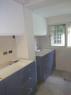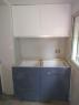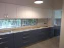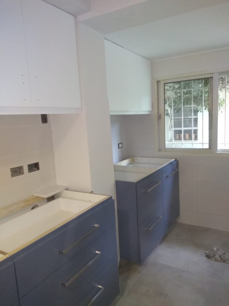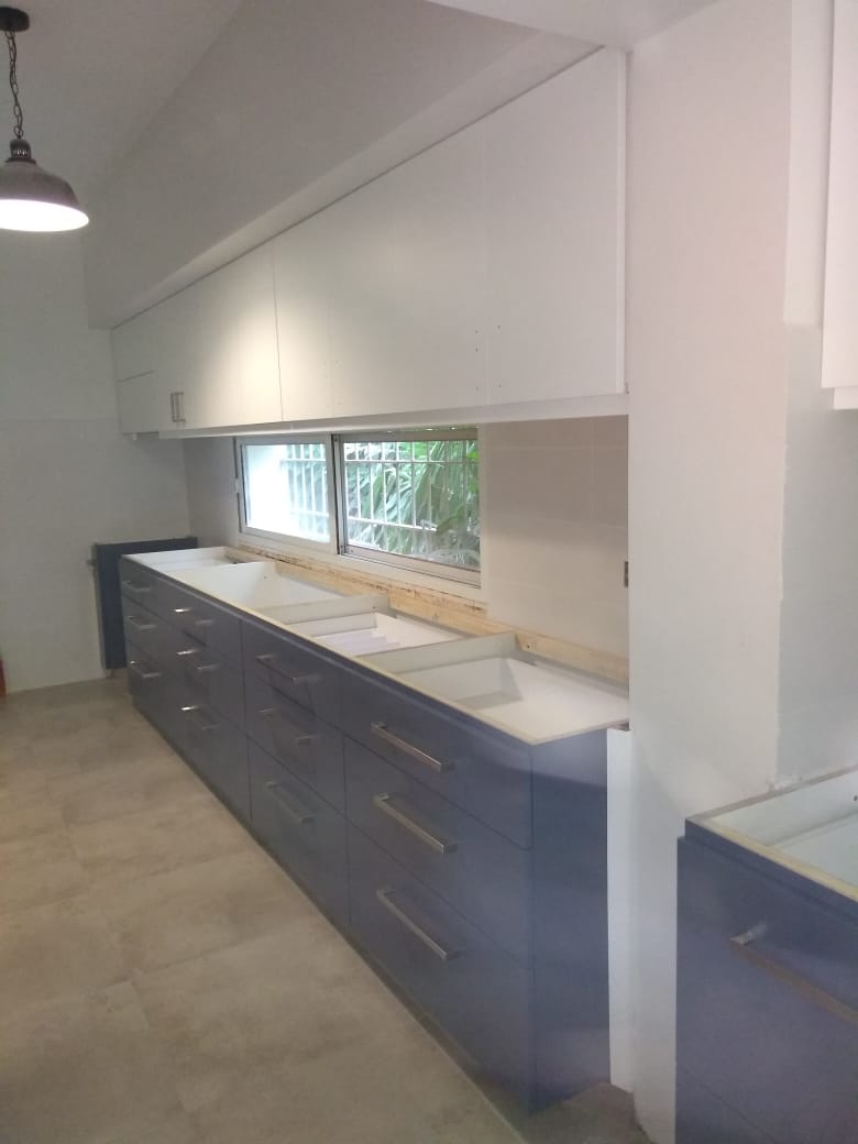 Cocina Mixta Blanca y Azul Alacena laqueada poliuretano blanco satinado y Bajo Mesada laqueado poliuretanico Azul Distance satinado.